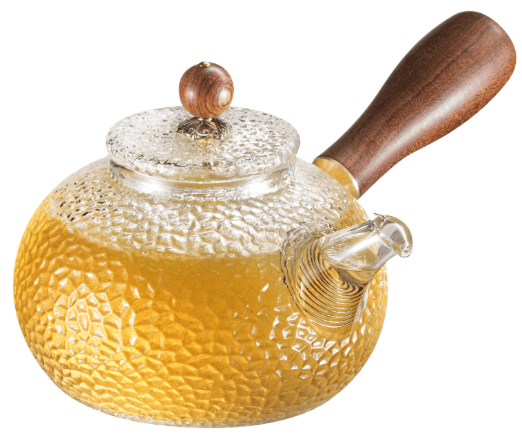 Glass Kyusu teapot, 300 ml, with a removable spout strainer and a wooden side handle made of sandalwood. The strainer makes brewing loose-leaf tea easy and clean. Perfect for one or two people, allowing you to enjoy your tea while watching the leaves gracefully unfurl.